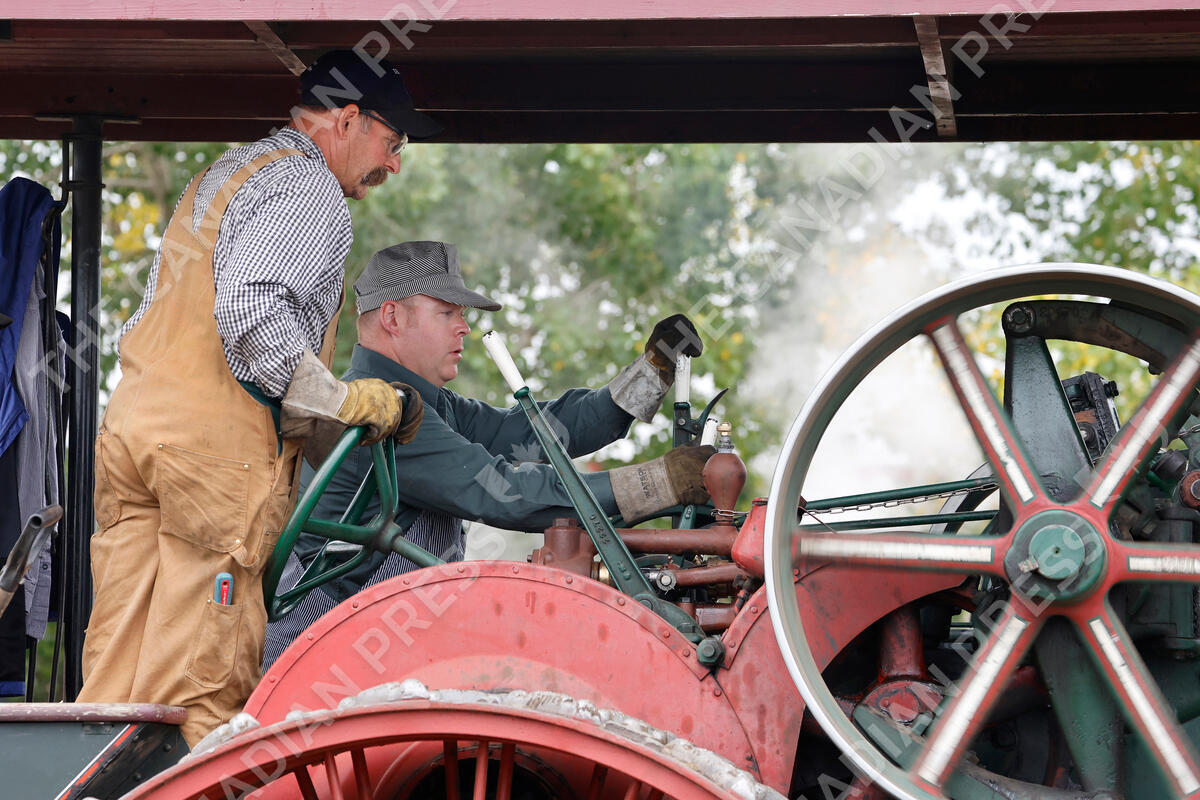 Men operate a vintage J.I. Case steam tractor during a demonstration near Irricana, Alberta on Aug. 12, 2023. THE CANADIAN PRESS IMAGES/Larry MacDougal