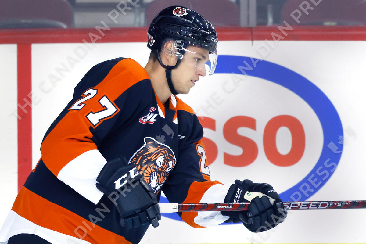Medicine Hat Tigers player Bogdans Hodass, from Latvia, during a WHL (Western Hockey League) hockey game against the Calgary Hitmen in Calgary, Alta., Sept. 22, 2023. THE CANADIAN PRESS IMAGES/Larry MacDougal