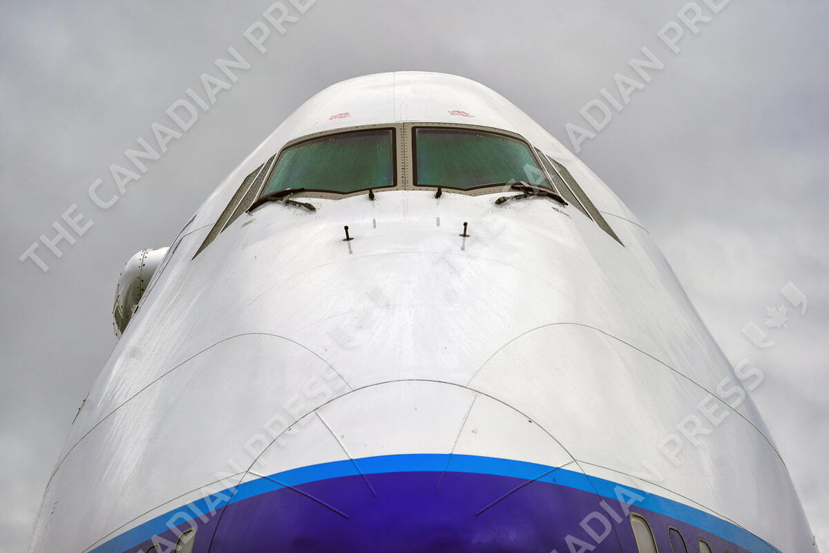 The windscreen of the Pratt & Whitney 747 Jumbo jet testbed is pictured at the Volaria Airshow in Mirabel, Quebec, Sunday, September 10, 2023. THE CANADIAN PRESS IMAGES/Mario Beauregard