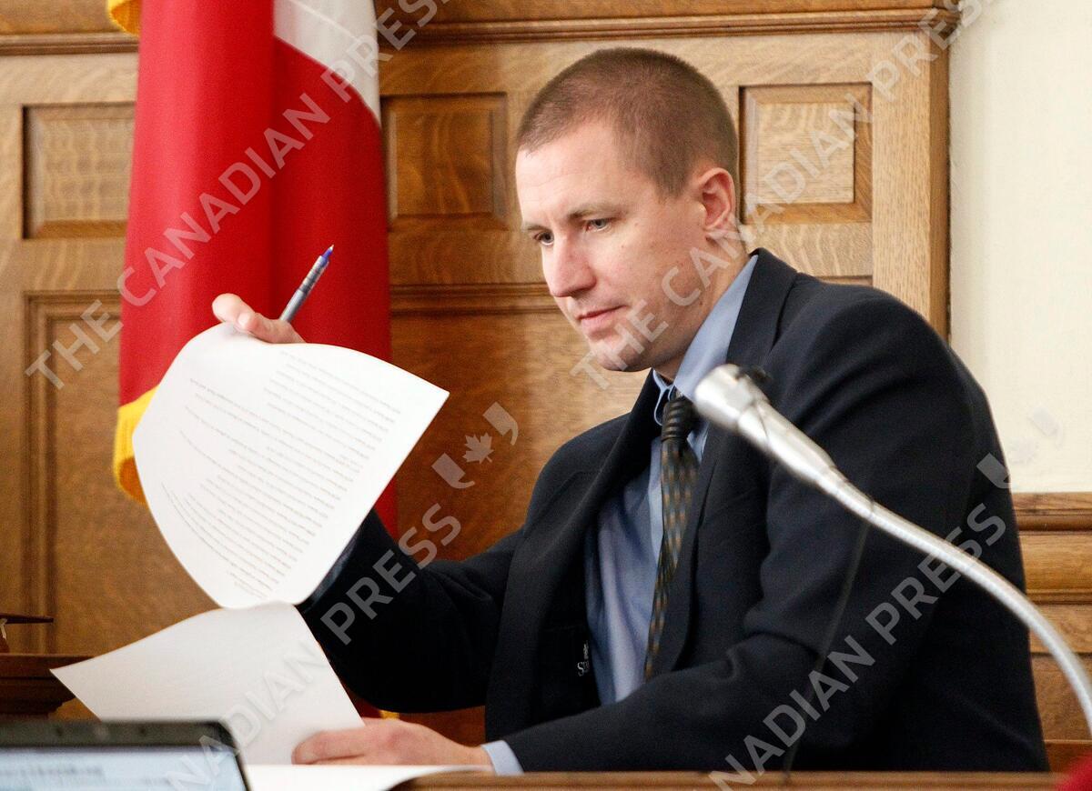 UI Police Detective Brian Meyer looks over phone records during the second-degree sexual abuse trial of former football player Cedric Everson Wednesday, Jan. 12, 2011 at the Johnson County District Courthouse in Iowa City, Iowa. Everson is accused of sexually assaulting a female student athlete in a Hillcrest residence hall dorm room on the UI campus in Oct. 2007. (AP Photo/Liz Martin, Pool)