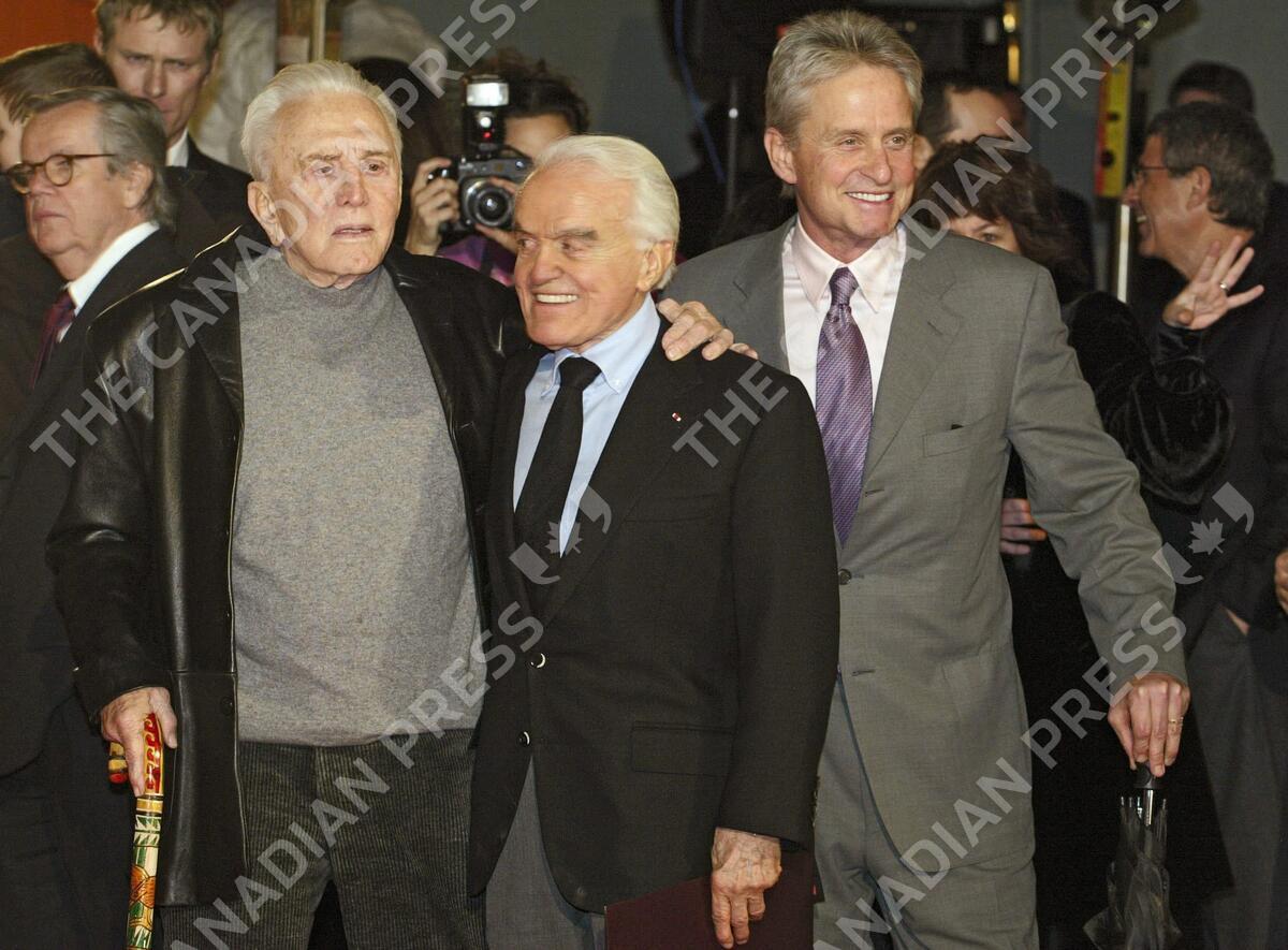 ** FILE ** Jack Valenti, president emeritus of the Motion Picture Association of America, pauses for a photo with actors Kirk Douglas, left, and Michael Douglas, right, after placing his hands and footprints in cement at Graumans Chinese Theatre, in this Dec. 6, 2004, file photo in the Hollywood section of Los Angeles. Valenti, the former White House aide and film industry lobbyist who instituted the modern movie ratings system and guided Hollywood from the censorship era to the digital age, died Thursday, April 26, 2007. He was 85. (AP Photo/Damian Dovarganes)