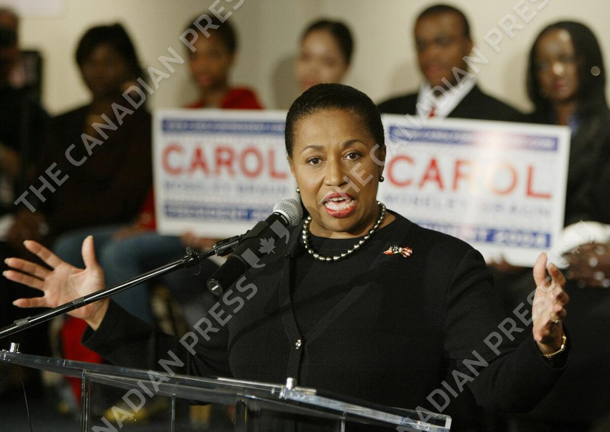 **FILE**Democrat Carol Moseley Braun, the only black woman to serve in the U.S. Senate, gestures during a news conference at Howard University in Washington in this file photo from Sept. 22, 2003. The former U.S. senator and presidential candidate, suffered a broken wrist when a mugger tried to steal her purse, authorities said Saturday April 28, 2007. (AP Photo/Ron Edmonds-File)