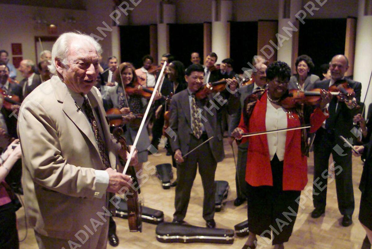 Isaac Stern teaches a music appreciation class at Carnegie Hall for New York school superintendants in this June 10, 2000, photo in New York. The 80-year-old virtuoso, known in New York as the man who saved Carnegie Hall in the 1960s, survived heart surgery in early September. (AP Photo/Suzanne Plunkett)