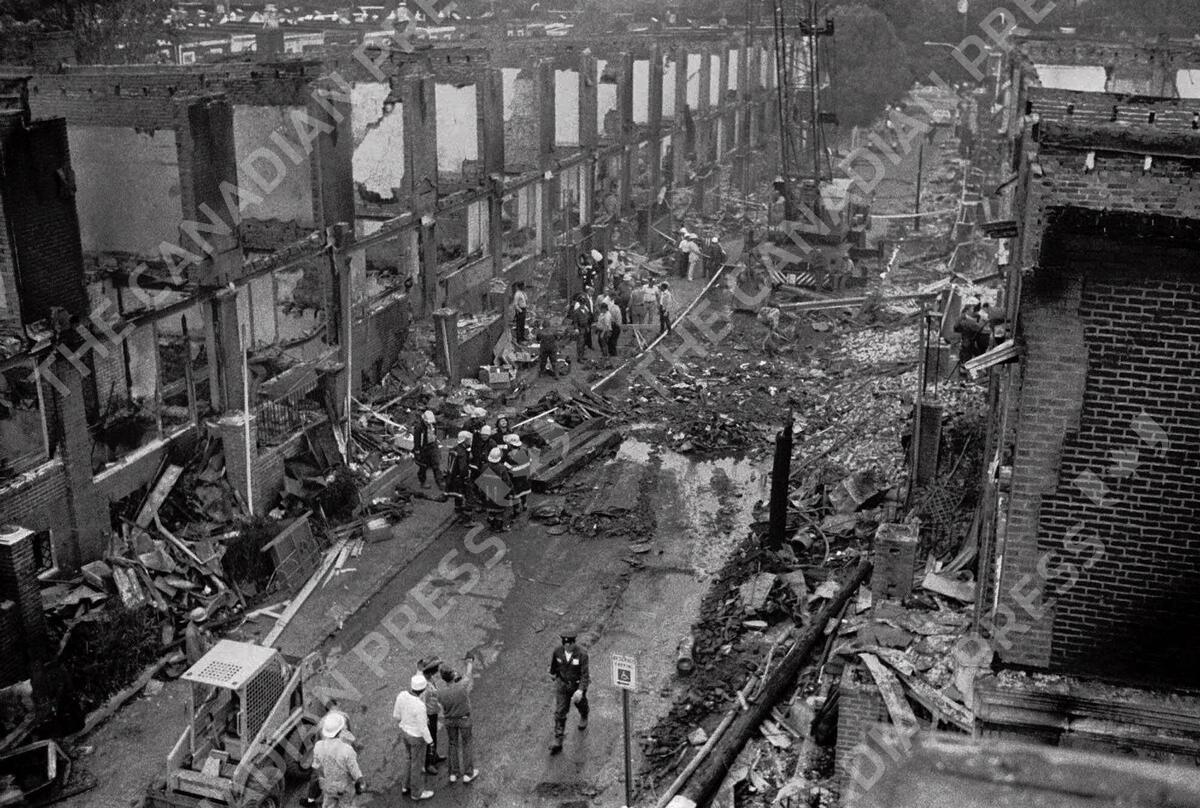 Police, firemen, and workers search through the rubble on Osage Avenue in West Philadelphia May 15, 1985 in the aftermath of a blaze which destroyed 61 homes in the neighborhood. After police dropped a bomb on the house occupied by members of a radical group called MOVE, the massive fire ignited, resulting in the death of eleven people. This incident is one that Philadelphia is notorious for, as the city went into a tailspin from the 1960's through the 1980's. (AP Photo)