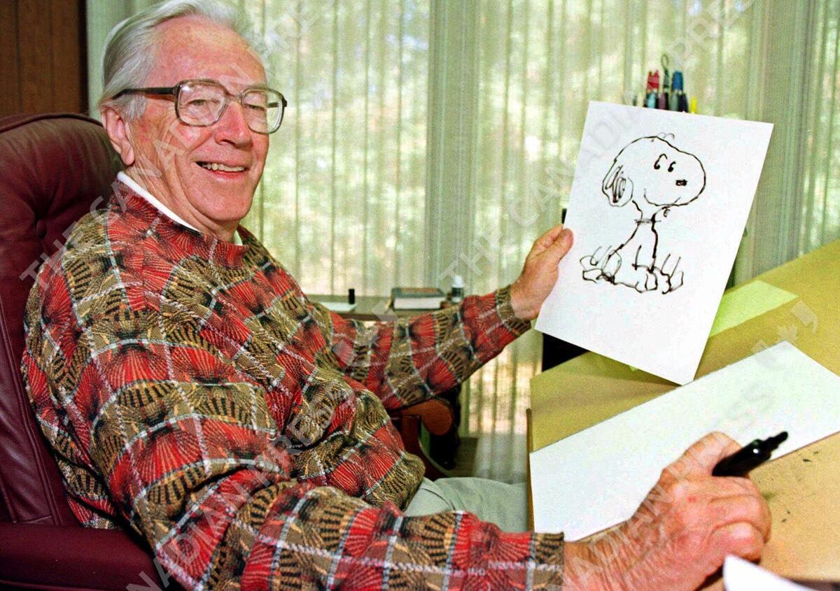 Cartoonist Charles Schulz displays a sketch of his beloved character "Snoopy" in his office in Santa Rosa, Calif. in this 1997 photo. An auction of Snoopy statues on Sunday, Oct. 1, 2000, fetched $823,000 that will help fund memorials to "Peanuts'' creator Charles Schulz. "Peanuts'' fans from across the country paid $200 each just for the right to bid on the 40 statues sold by Sotheby's at the Mall of America. The statues were among the 101 Snoopys created and designed by local artists that graced St. Paul this summer as a tribute to the late cartoonist and native son. (AP Photo/Ben Margot)