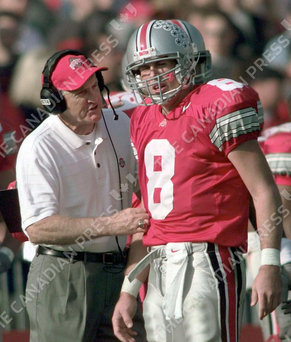Ohio State head coach John Cooper advises quarterback Steve Bellisari during the fourth quarter of Ohio State's 46-20 loss to Illinois in Columbus, Ohio in this November 3, 1999 photo. Things were not pleasant in Ohio after the Buckeyes went 6-6. But 15 starters are back from a team that coach John Cooper notes lost to six teams that won bowl games. (AP Photo/Jay LaPrete)