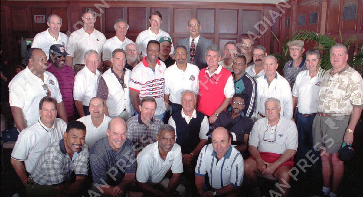 ** FILE ** Team members of the 1972 Miami Dolphins perfect season pose at a news conference as they gathered in Miami, in this Nov.17, 1997 photo, to mark the 25th anniversary of the team that went 17-0 and beat the Redskins 14-7 in Super Bowl VII. (AP Photo/Gregory Smith)