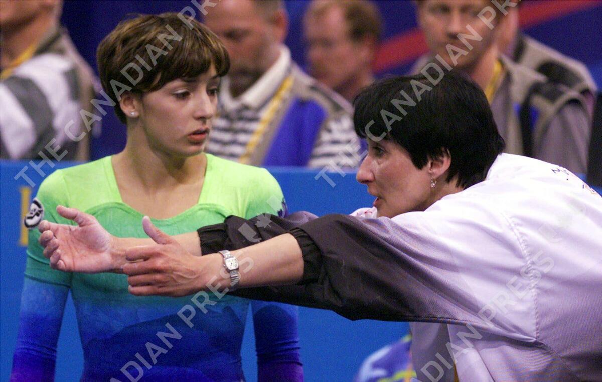 Canadian gymnist Yvonne Tousek, left, gets instruction from Canadian coach Elyira Saadi during practice for the 2000 Summer Olympic Games at the Superdome in Sydney, Thursday, Sept. 14, 2000. (AP Photo/Amy Sancetta)