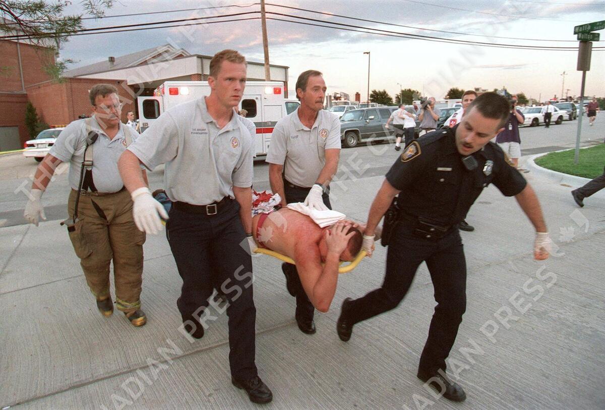 Officials carry a shooting victim from the Wedgewood Baptist Church in Fort Worth, Texas, Wednesday, Sept. 15, 1999, after a gunman opened fire inside the church killing at least six and injuring eight people Wednesday. (AP Photo/Fort Worth Star Telegram, Rodger Mallison)