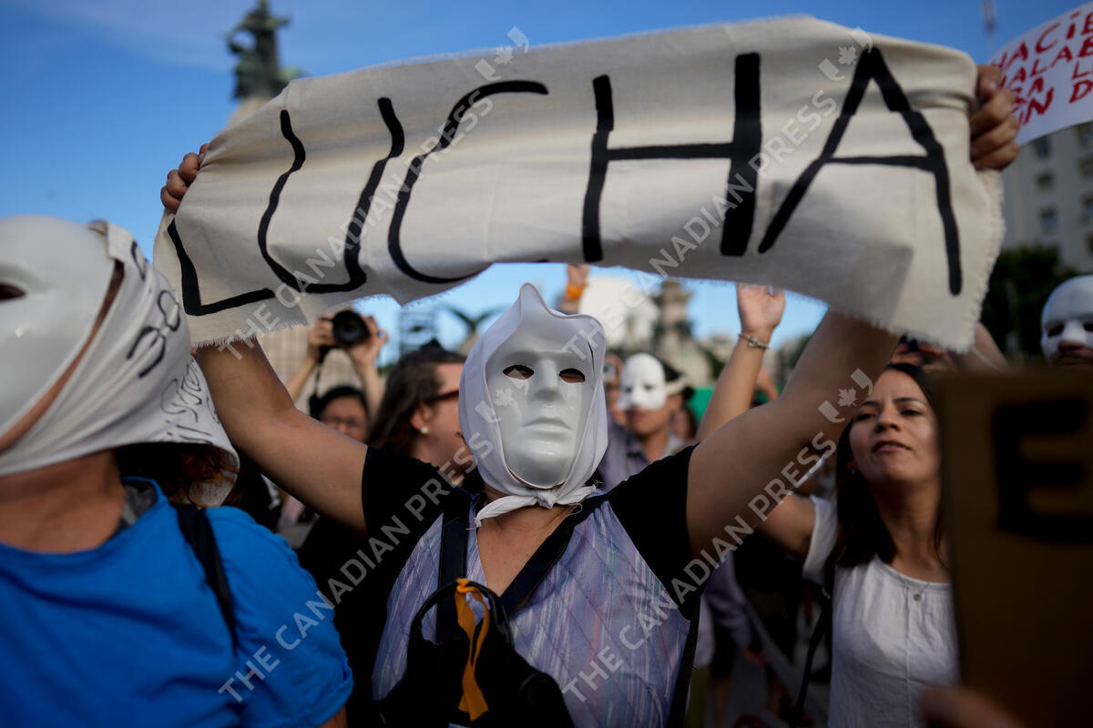 A woman wearing a mask holds a banner emblazoned with the Spanish word for fight, during a protest against measures regarding the cultural policies of President Javier Milei's government, in Buenos Aires, Argentina, Thursday, Jan. 4, 2024. (AP Photo/Natacha Pisarenko)