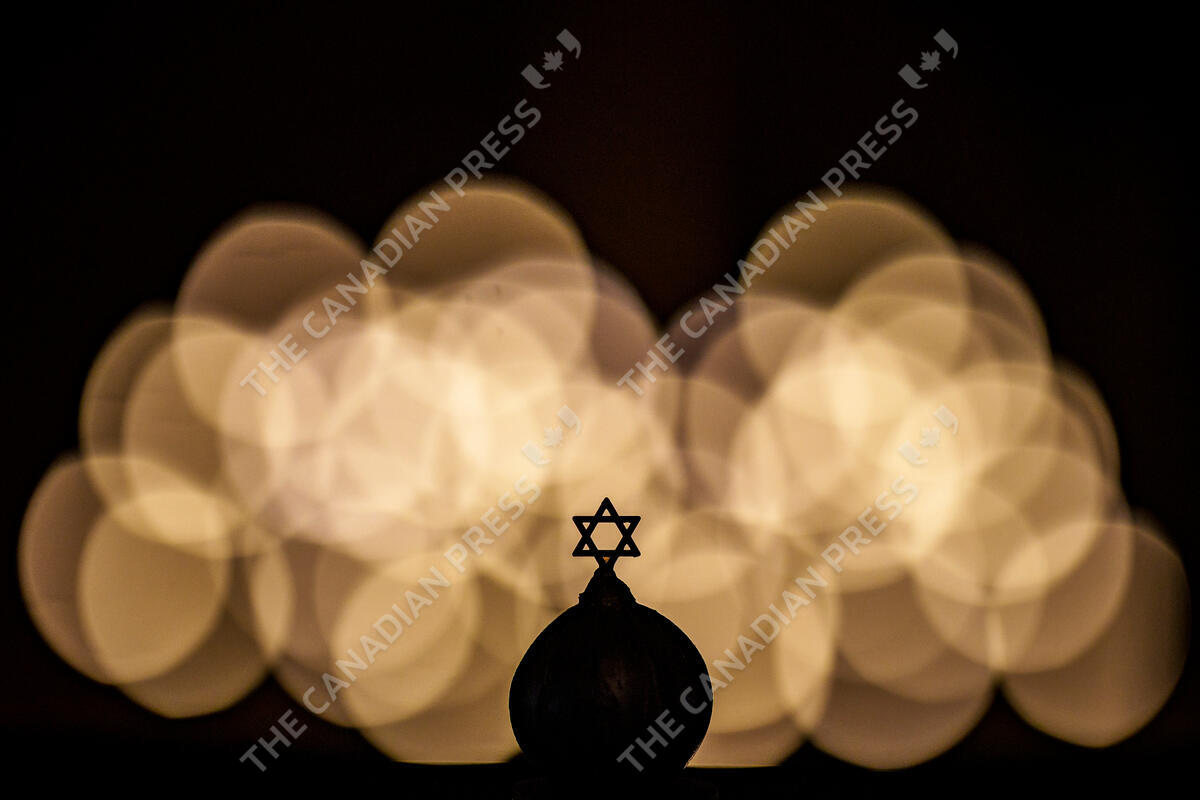 The Star of David is silhouetted against light installations during a memorial for the victims of the Holocaust, at the Coral Temple synagogue in Bucharest, Romania, Monday, Jan. 29, 2024. (AP Photo/Andreea Alexandru)