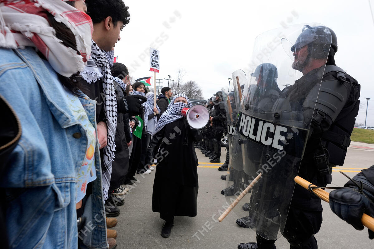 Pro-Palestinian demonstrators march against police during a visit by President Joe Biden in Warren, Mich., Thursday, Feb. 1, 2024. (AP Photo/Paul Sancya)