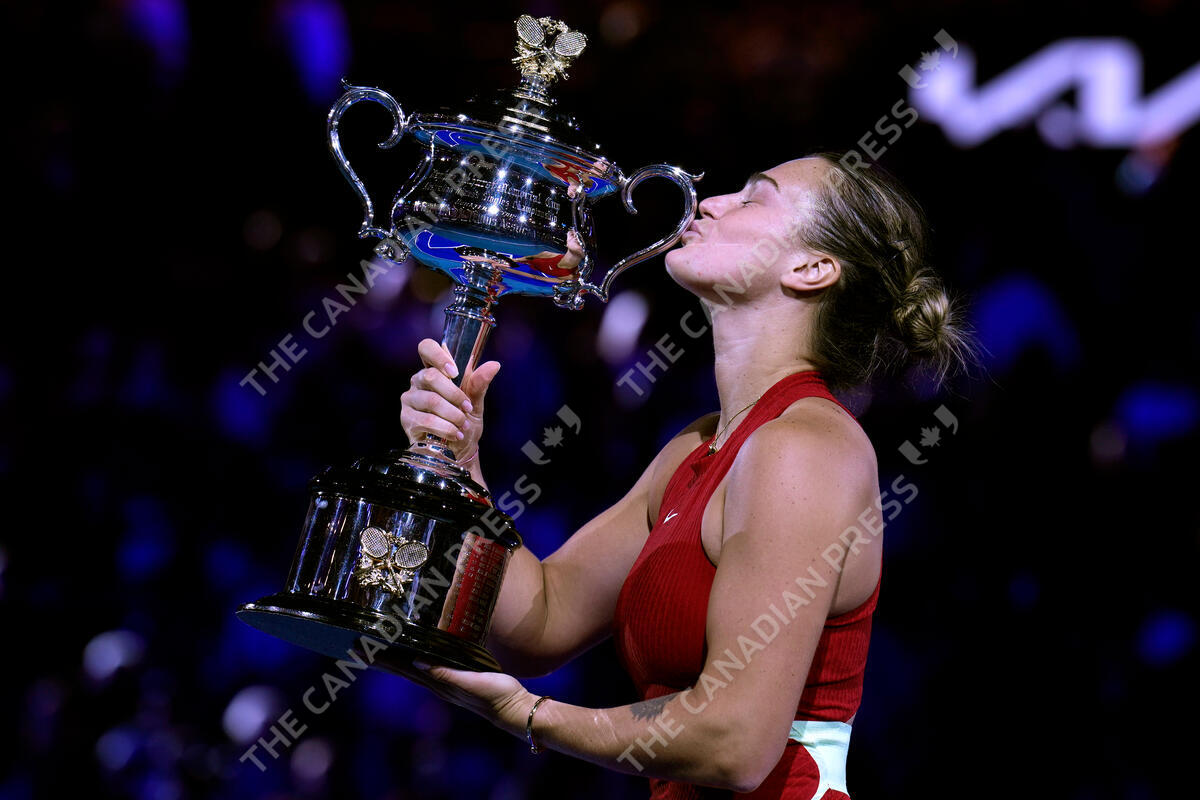 Aryna Sabalenka of Belarus kisses the Daphne Akhurst Memorial Cup after defeating Zheng Qinwen of China in the women's singles final at the Australian Open tennis championships at Melbourne Park, Melbourne, Australia, Saturday, Jan. 27, 2024. (AP Photo/Andy Wong)