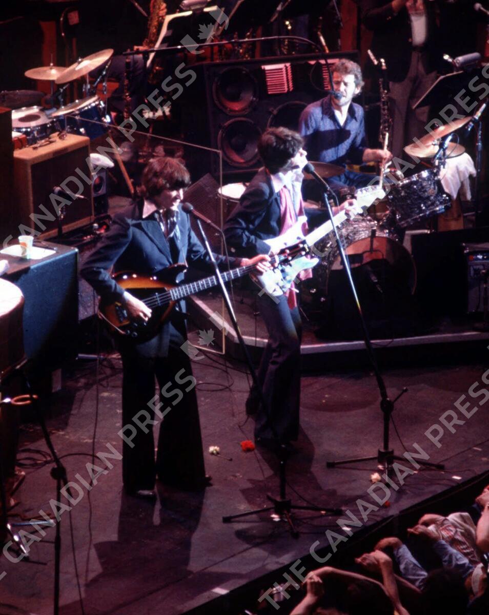 ** FILE** The Band is shown during their farewell concert "The Last Waltz" at the Winterland Auditorium in San Francisco in this Nov. 25, 1976, file photo. From left, are; Rick Danko, guitarist Robbie Robertson and drummer Levon Helm. Helm, right, In a lawsuit filed in New York state Supreme Court in December, 2007, is suing a Manhattan advertising firm over the use of the band's signature song, "The Weight," in a television commercial. (AP Photo/John Storey, File )