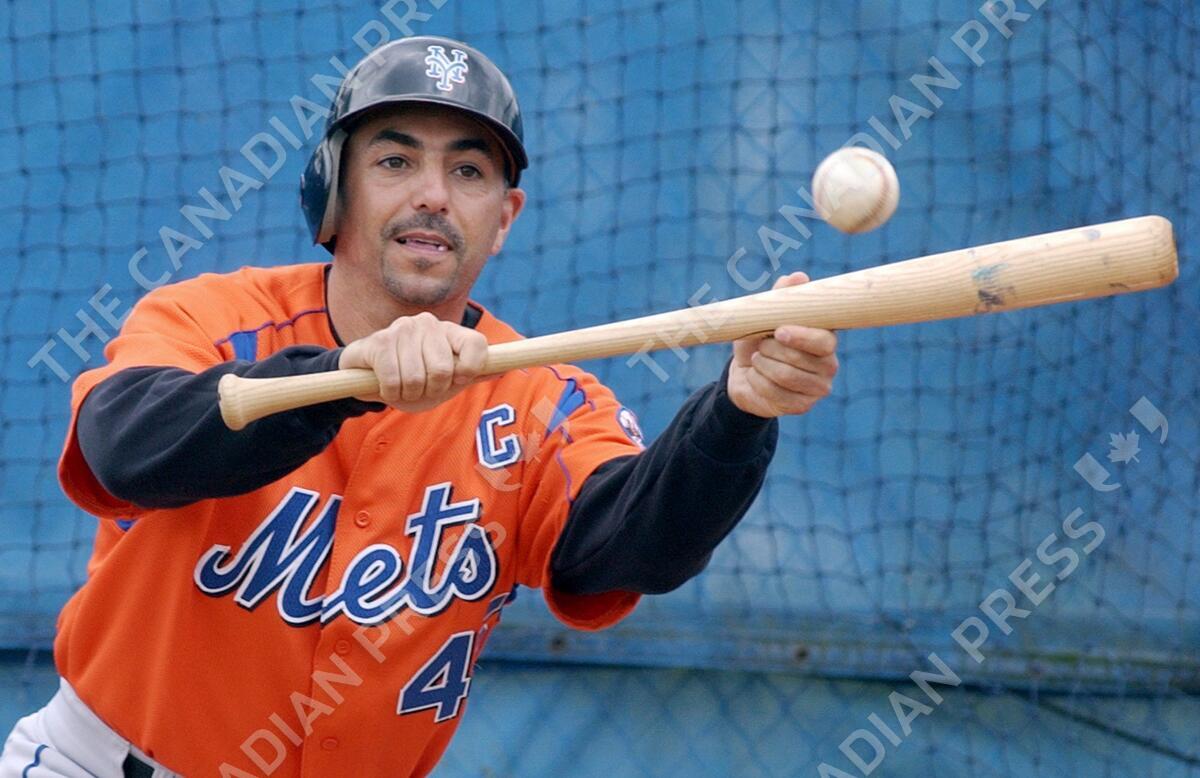 **FILE**New York Mets relief pitcher John Franco takes bunting practice during spring training in Port St. Lucie, Fla., in this Feb. 25, 2003 file photo. Franco testified Monday, March 12, 2007 before the New York City council in support of a proposed ban on metal bats in New York City high schools. "I'm speaking from someone who was standing on the mound for 22 years, and I can see the difference," Franco told a council committee. "And while I'm standing in the stands watching my son play, or some of the other Little Leaguers, I can see the difference." (AP Photo/Richard Drew, File)