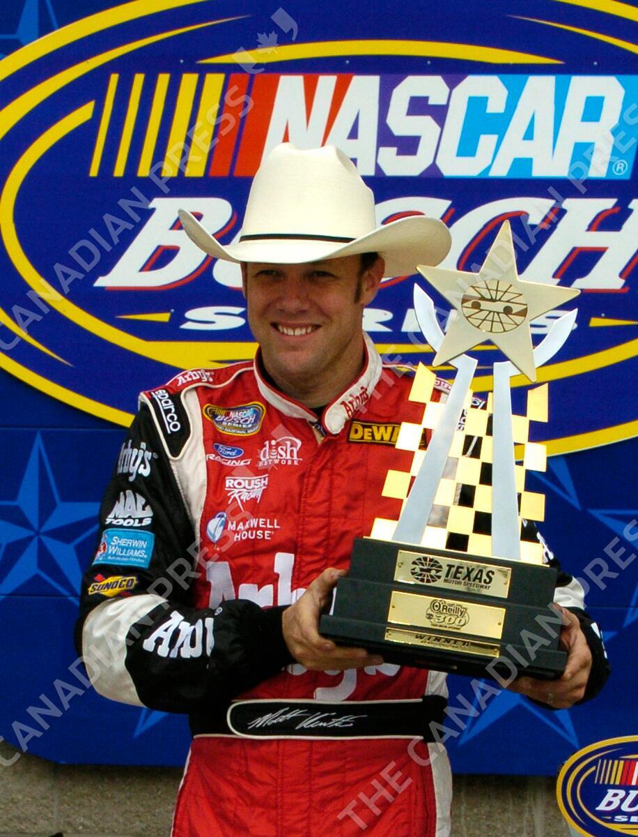 Matt Kenseth poses with the trophy after winning the NASCAR Busch Series' O'Reilly 300 auto race at Texas Motor Speedway in Fort Worth, Texas, Saturday, April 14, 2007. (AP Photo/Larry Papke)
