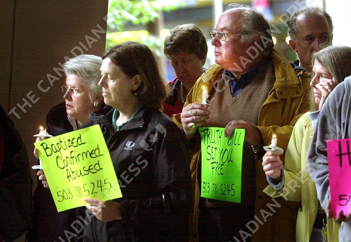 ** FILE ** Protestors hold signs and candles during a vigil for victims of sexual abuse by priests in front of the federal courthouse in Portland, Ore., July 6, 2004, where Portland Archbishop John Vlazny appeared for testimony in a bankruptcy hearing for the Portland Archdiocese. A judge overseeing the bankruptcy filing of the Archdiocese is to confirm a proposed $75 million settlement for alleged victims of sexual abuse by priests, according to court documents filed Friday, April 13, 2007. (AP Photo/Don Ryan, file)
