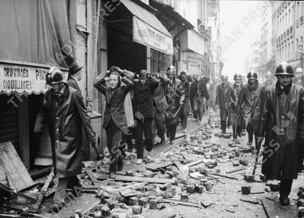 Policemen with helmets amd clubs march a group of arrested students with their arms behind their heads to the Pantheon Police Headquarters through a sea of cobblestones after heavy streetfights in Latin Quarter in Paris, France, May 11, 1968 (AP Photo/stf)