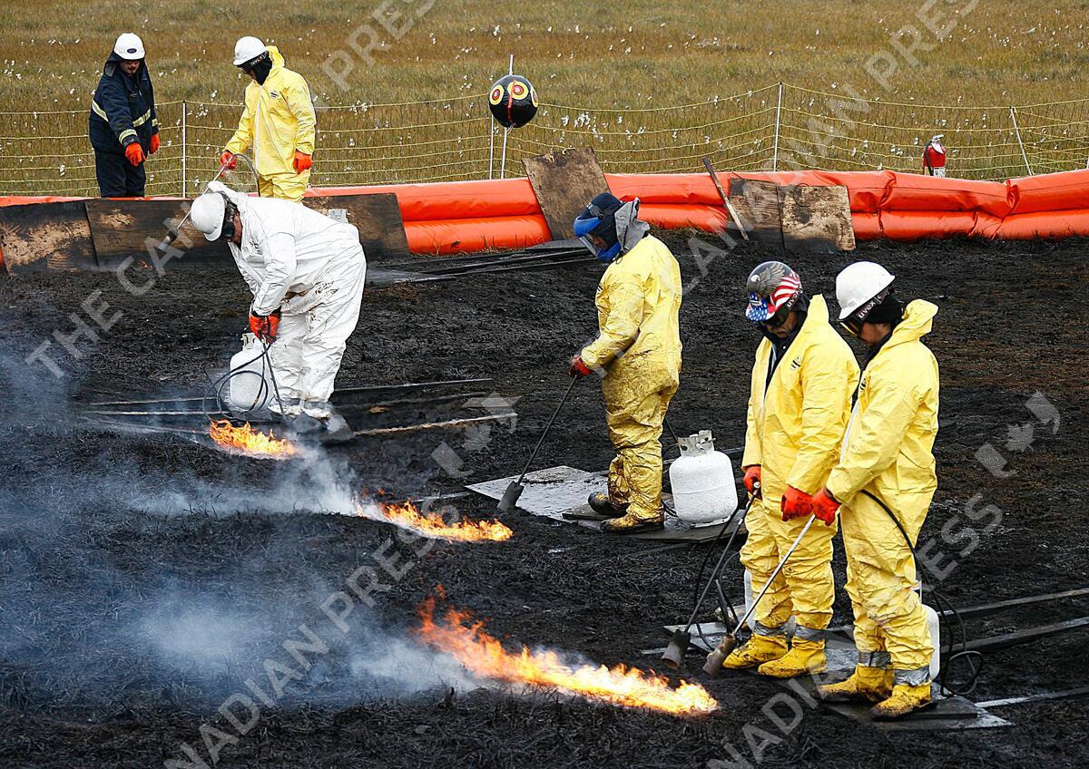 **ADVANCE FOR WEEKEND AUG. 11-12 ** Workers burn oil off the tundra from a leak in an oil transit line at the Prudhoe Bay oil field on Alaska's North Slope, Aug. 19, 2006. An upcoming state study shows that all kinds of spills, from crude to gasoline to tainted water, have occurred with regularity over the last decade on the remote wetlands of the Arctic tundra. AP Photo/Al Grillo)