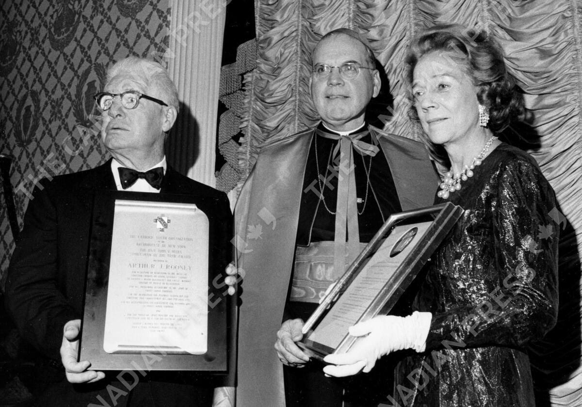 ** FILE **Terence Cardinal Cook, center, poses with New York philantropist Brooke Astor, right, and Pittsburgh Steelers President Arthur J. Rooney, recipients of the Annual Archdiocese of New York Catholic Youth Organization awards, in this Feb. 2, 1972 file photo. Astor, the civic leader, philanthropist and high society fixture who gave away nearly $200 million to support the city's great cultural institutions and a host of humbler projects, died of pneumonia at her suburban estate Monday, Aug. 13, 2007 at 105. (AP Photo, File)