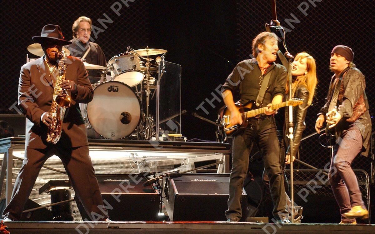 **FILE**Bruce Springsteen, third from right, performs with members of the E Street Band during a performance at Shea Stadium, Oct. 1, 2003, in New York. Left to right, Clarence Clemons, Max Weinberg, Springsteen, Patti Scialfa, and Steve Van Zandt. The Rock and Roll Hall of Famer returns Oct. 2, 2007, with a new album, titled "Magic," his first collaboration with his longtime New Jersey mates since the Sept. 11-inspired "The Rising" in 2002, Springsteen announced through his publicist Thursday, Aug. 16,2007.(AP Photo/Mary Altaffer)
