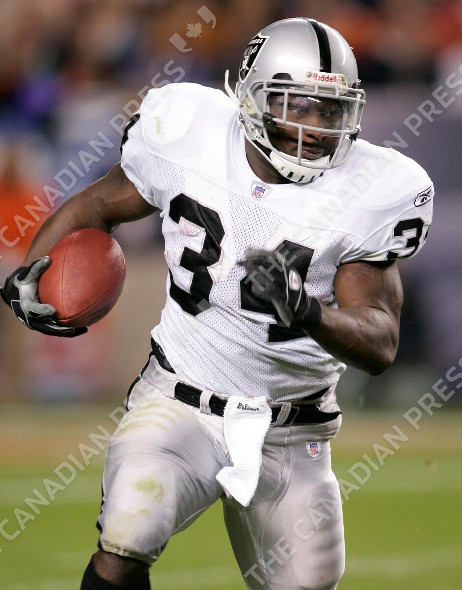 **FILE** Oakland Raiders running back LaMont Jordan (34) turns the ball up field against the Denver Broncos during an NFL football game in Denver in this Oct. 15, 2006 file photo. Jordan knows full well that he has plenty of doubters heading into his third season in Oakland after he rushed for only 434 yards in nine games last season before it was cut short by a knee injury. (AP Photo/Jack Dempsey, File)