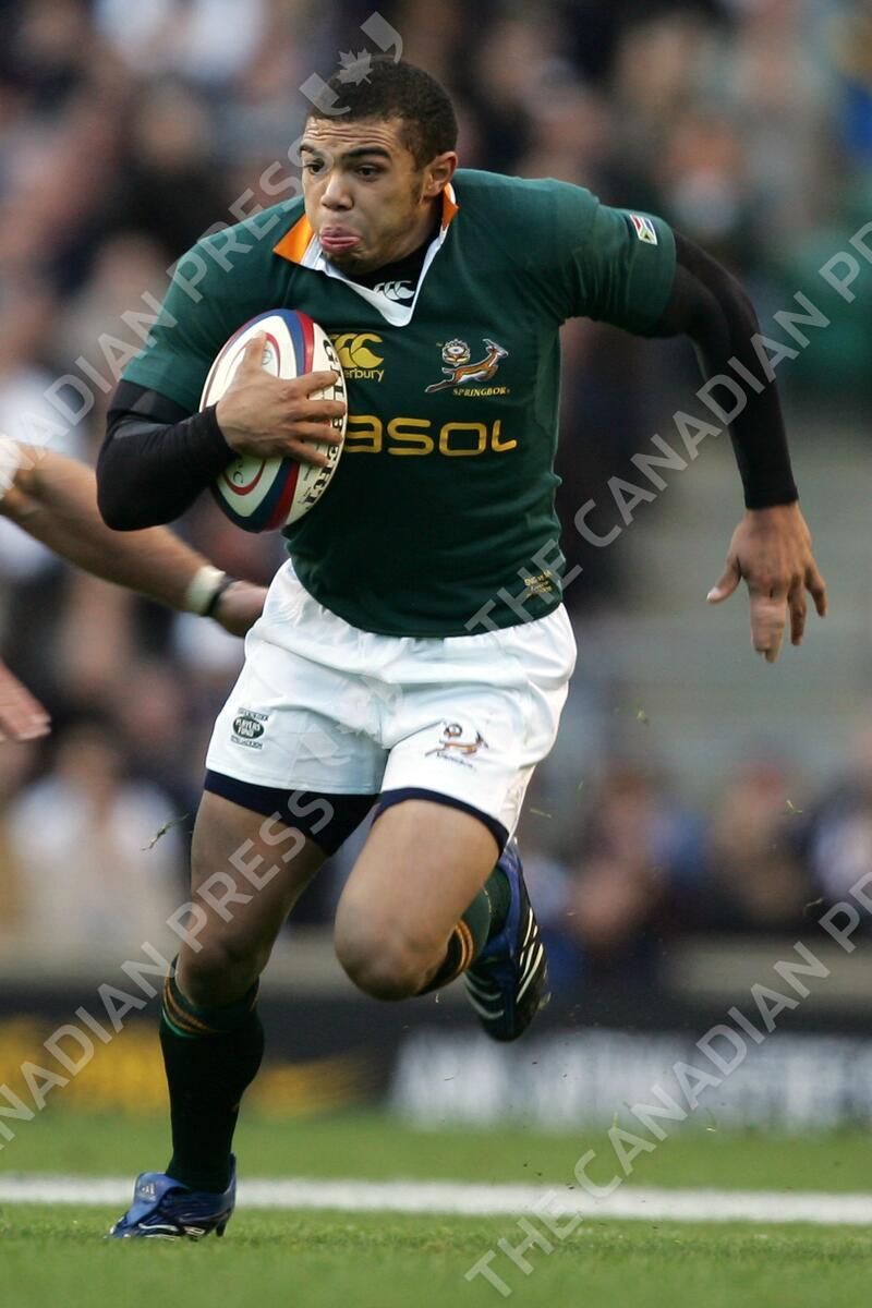 South Africa's Bryan Habana runs with the ball during their rugby union international match against England at Twickenham stadium in west London, Saturday Nov. 18, 2006. (AP Photo/Tom Hevezi)