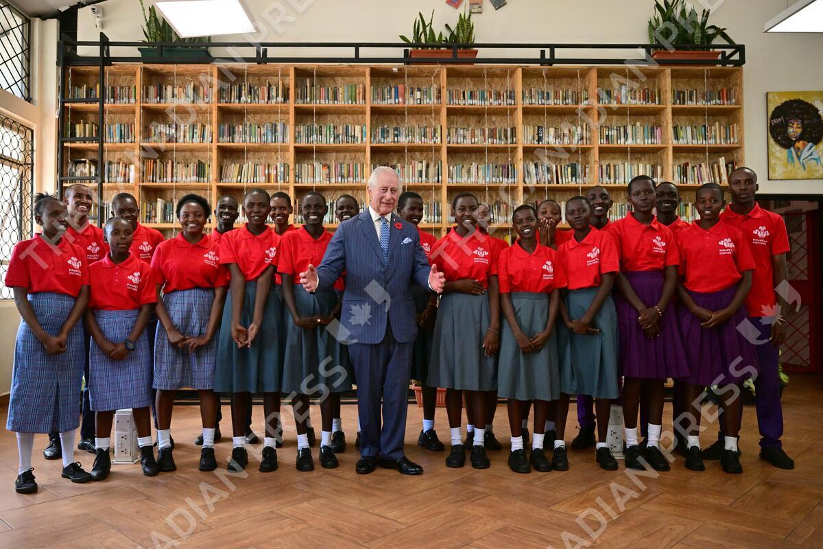 King Charles III meets young people taking part in a Prince's Trust International (PTI) Enterprise Challenge, during a visit to the Eastlands Library in Nairobi, on day one of the State Visit to Kenya. Picture date: Tuesday October 31, 2023.