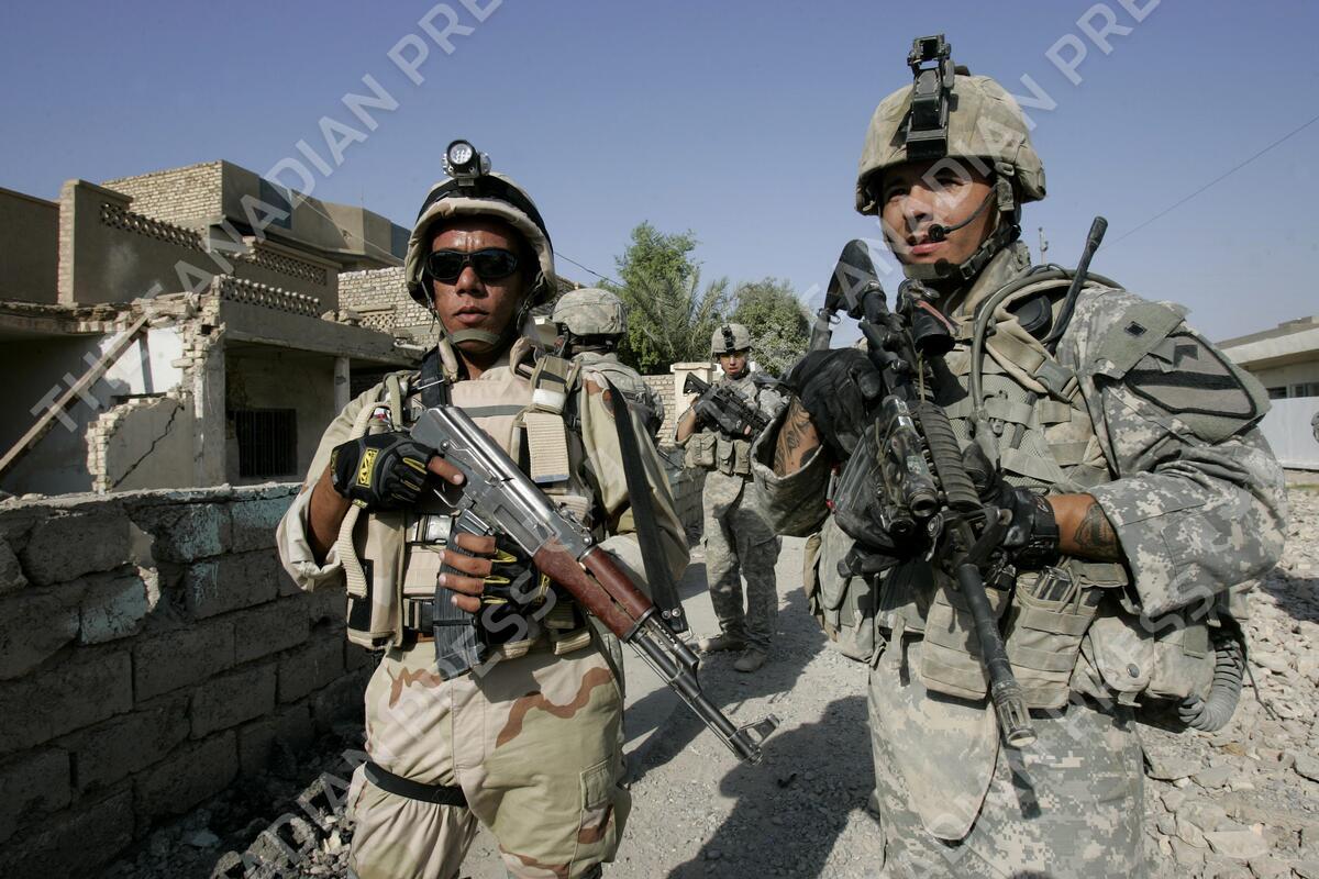 U.S soldier's from Bravo 112 Cav. Battalion and an Iraqi soldier, left, during a foot patrol in the city of Baqouba, 60 kilometers (35 miles) northeast of Baghdad on Sunday, Sept, 2, 2007.(AP Photo/Karel Prinsloo)