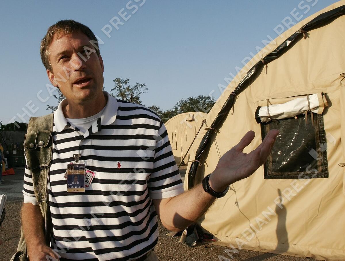 Dr. Peter DeBlieux discusses the symptoms of respiratory problems in front of the "Spirit of Charity Clinic" in New Orleans on Wednesday Nov. 9, 2005. "Everybody's calling it the Katrina Cough," he said, but whether it's mold, dust, allergies or some other cause isn't known. (AP Photo/Bill Haber)