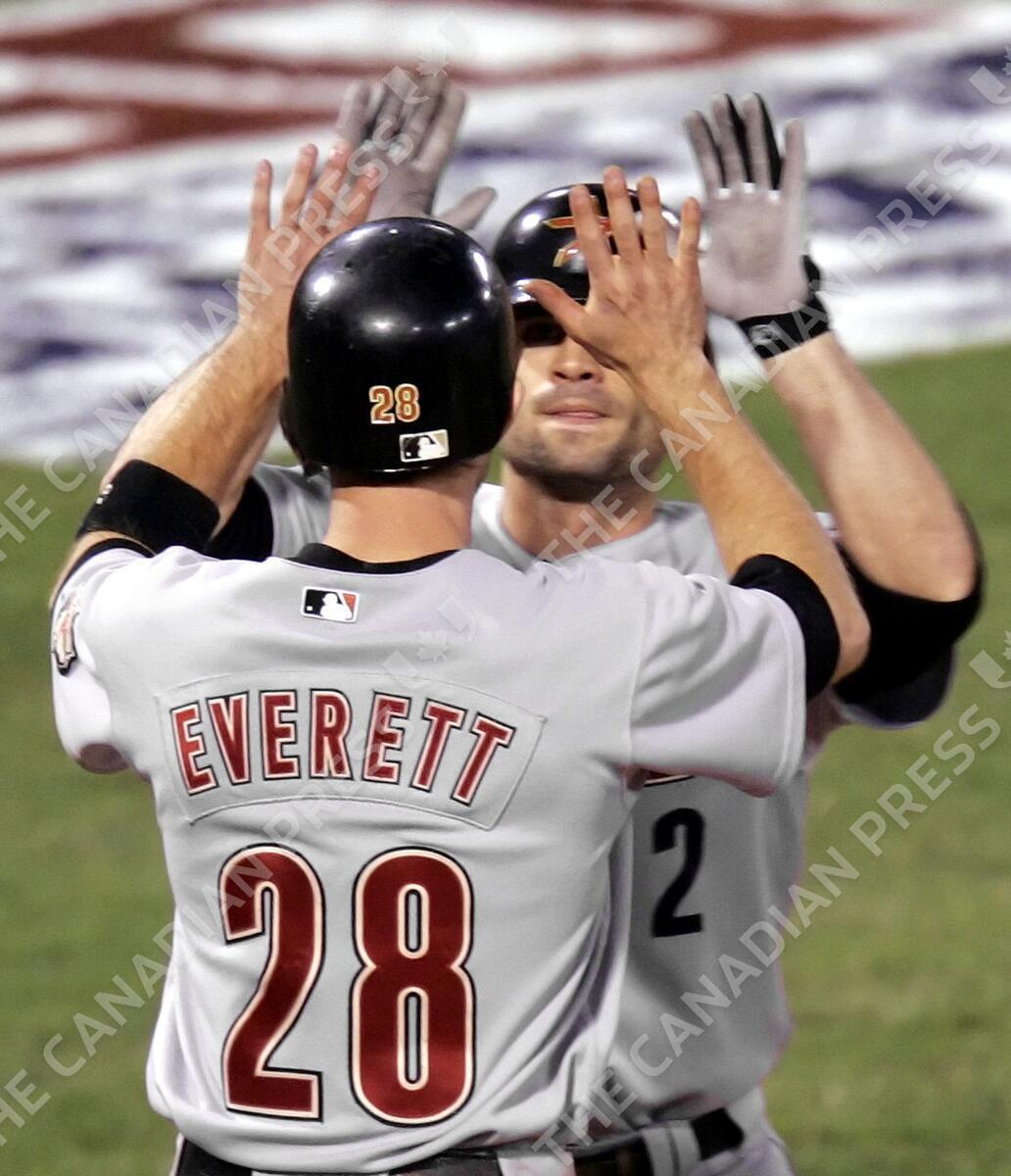 Houston Astros' Adam Everett (28) greets Chris Burke (2) after Burke's solo home run off St. Louis Cardinals pitcher Chris Carpenter in the seventh inning of Game 1 of the National League Championship Series Wednesday, Oct. 12, 2005, in St. Louis. Burke pinch-hit for pitcher Andy Pettitte and got the Astros' first run with the homer. (AP Photo/James A. Finley)