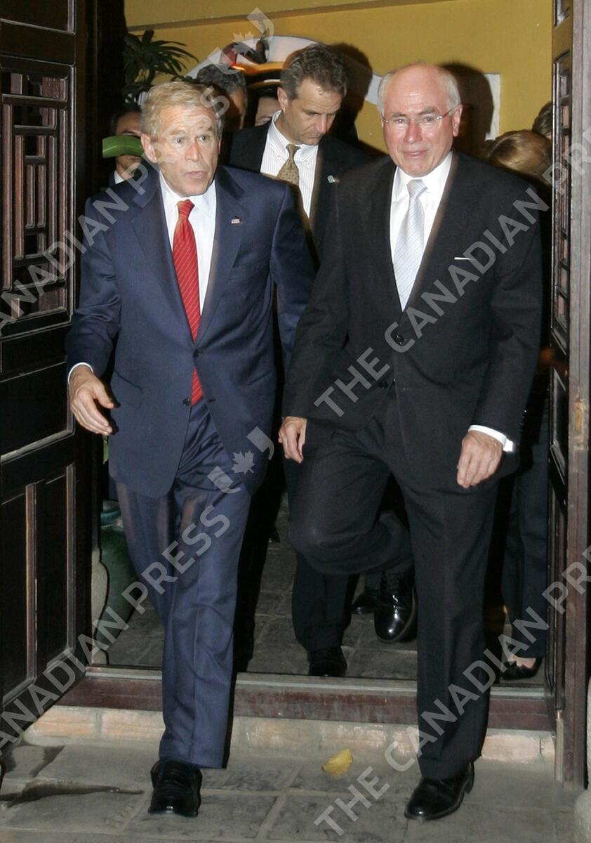 ** FILE ** U.S. President George W. Bush, left, and Australia's Prime Minister John Howard leave a restaurant after having dinner together in Ho Chi Minh City, Vietnam, in this Sunday, Nov. 19, 2006 file photo. Prime Minister John Howard's big moment in the spotlight may be his swan song. Howard hosts his country's largest-ever gathering of world leaders this week, the annual Asia Pacific Economic Cooperation summit. Soon after, he is expected to call general elections that opinion polls have been saying for months he is going to lose. This week's APEC summit brings together the leaders of 21 Pacific Rim nations, among them U.S. President George W. Bush. (AP Photo/Charles Dharapak, File)