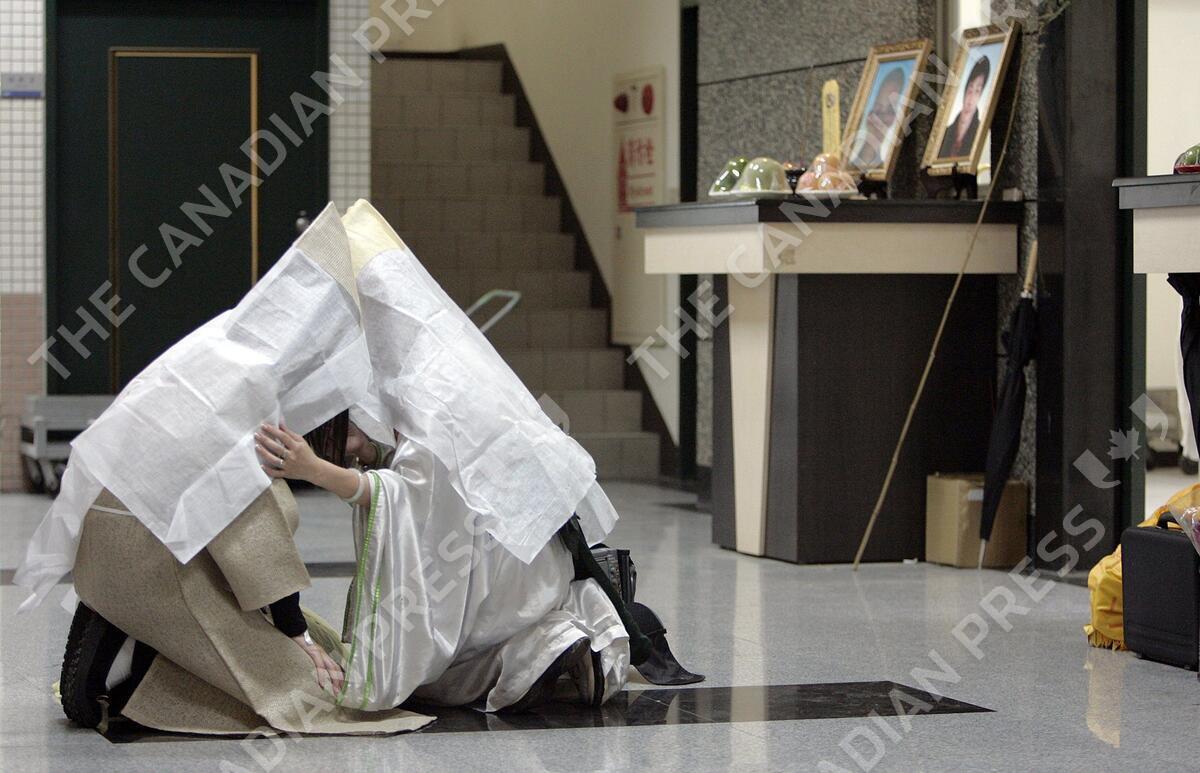 Draped in traditional Taiwanese funeral hood, a professional mourner of the "Filial Daughters' Band" wails into a microphone as she holds the daughter of a recently deceased relative at a funeral, Oct. 7, 2005, in Taipei, Taiwan. Members of the "Filial Daughters' Band" are third generation professional performers paid to publicly mourn at funerals and to perform acrobat and dance routines to help guide the souls of the dead in their travels in the afterlife. (AP Photo/Wally Santana)