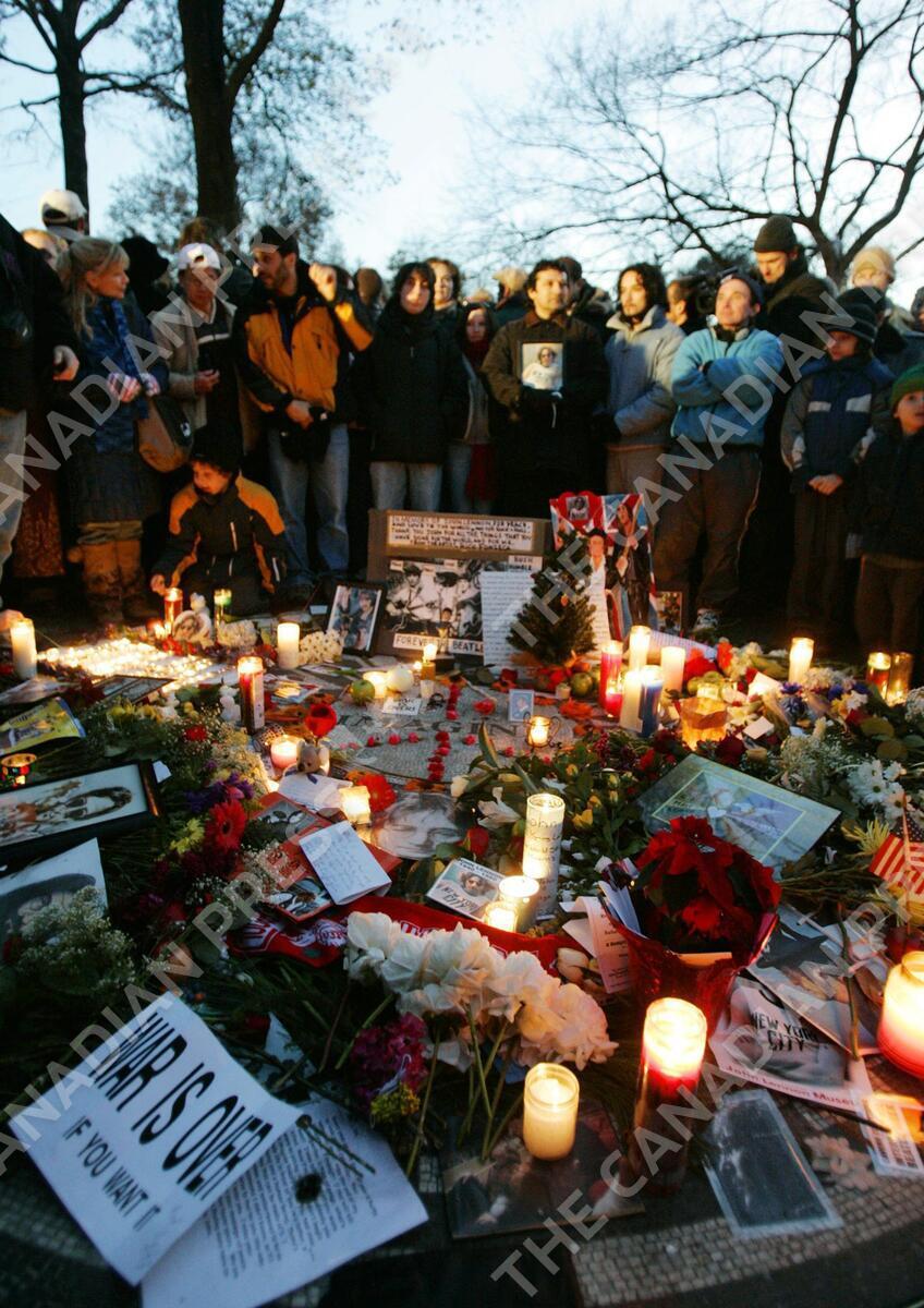 Flowers, candles and gifts line the 'Imagine' mosaic in the Strawberry Fields section of New York's Central Park, Thursday Dec. 8, 2005, the 25th anniversary of the murder of former Beatle John Lennon. The mosaic is a memorial to Lennon. (AP Photo/Frank Franklin II)