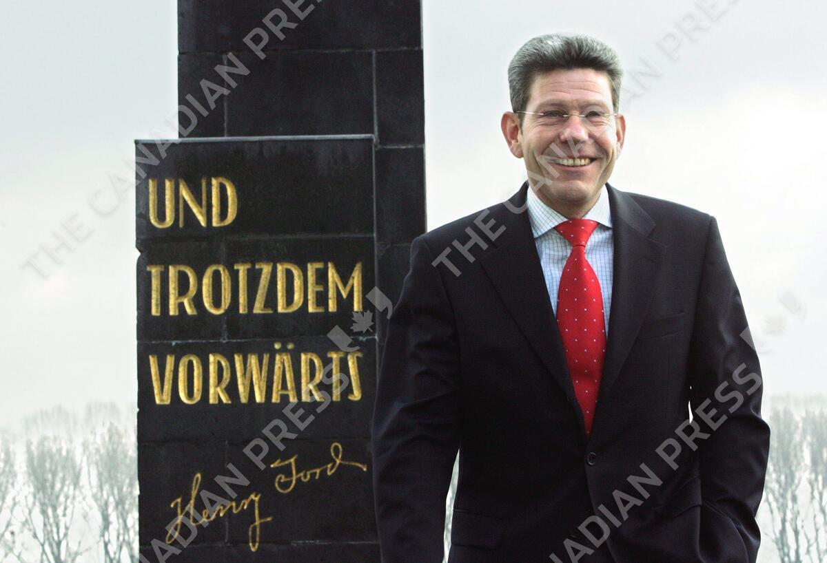 The CEO of Ford Werke GmbH, German Bernhard Mattes, is all smiles following a news conference in Cologne, Germany, Monday, March 6, 2006. Carmaker Ford announced Monday it would make no redundancies in Germany until 2011. Quote by Henry Ford in background translates "and anyhow ahead". (AP Photo/Hermann J. Knippertz)