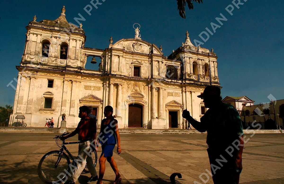 FILE ** Tourists walk in front of the Cathedral of the Asuncion in Leon, 90km north of Managua, Nicaragua, in this Feb. 7, 2005 file photo. Attracted by it's exhuberant nature, indigenous cultutres and vestiges of a colonial past, more and more tourists are now visiting Central America, a region that was once barely traveled due to it's internal political conflicts. (AP Photo/Esteban Felix, file)