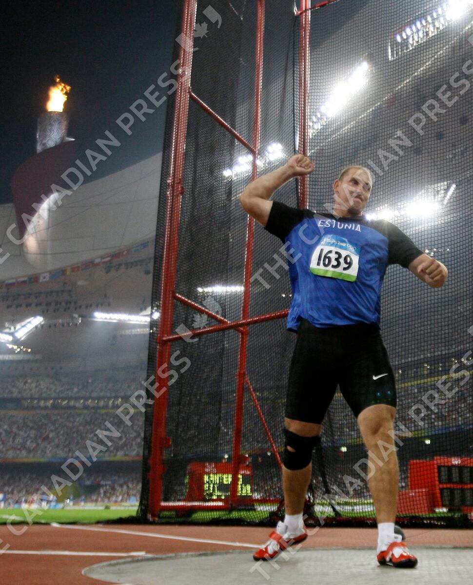 Estonia's Gerd Kanter makes an attempt in the final of the men's discus throw during the athletics competitions in the National Stadium at the Beijing 2008 Olympics in Beijing, Tuesday, Aug. 19, 2008. (AP Photo/David J. Phillip)