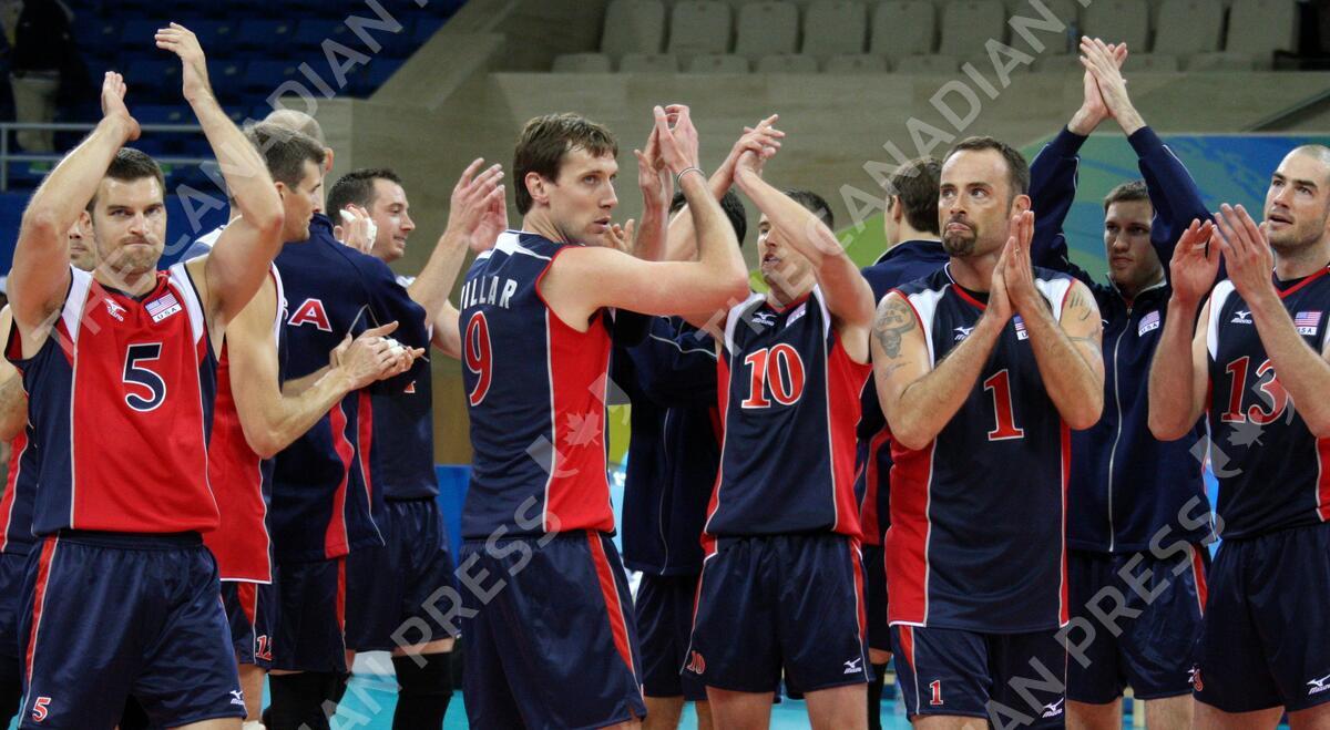 USA players, from left, Richard Lambourne (5), Ryan Millar (9), Riley Salmon (10), Lloy Ball (1), and Clayton Stanley celebrate their win over Italy during their men's volleyball preliminary match at the Beijing 2008 Olympics in Beijing, Tuesday, Aug. 12, 2008. (AP Photo/Koji Sasahara)