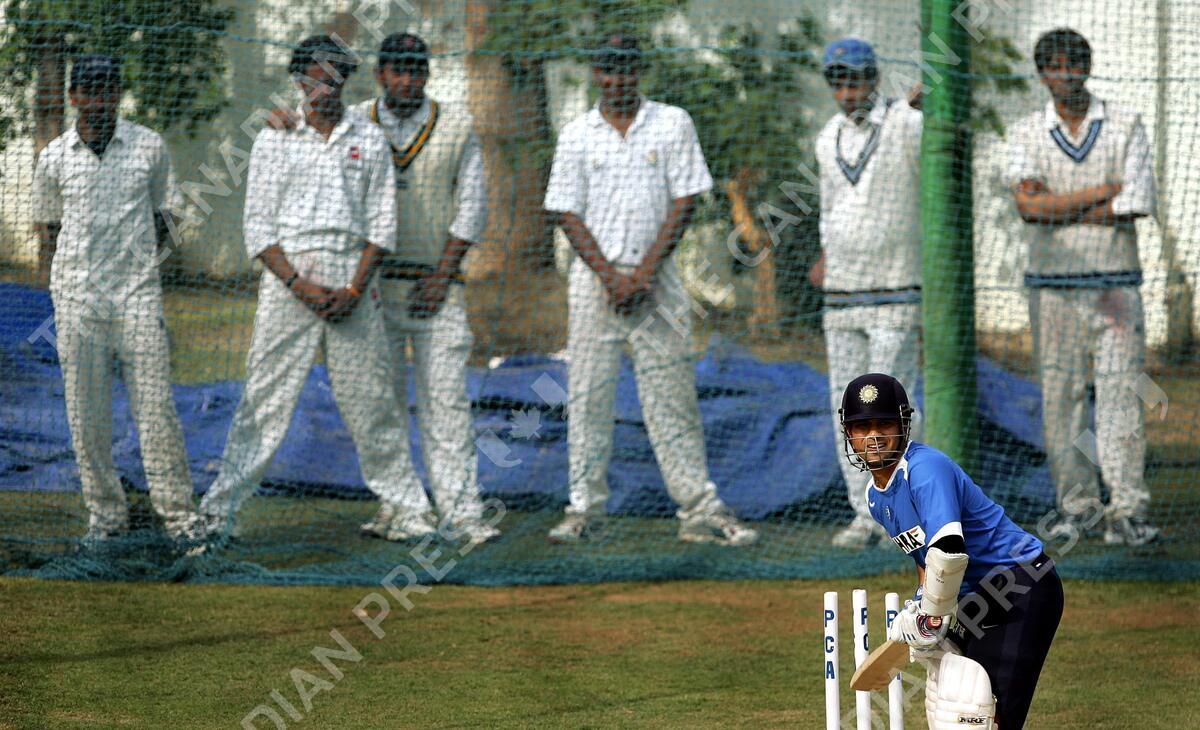 India's Sachin Tendulkar bats as ball boys look on during a practice session in Mohali, India, Tuesday, March 7, 2006. The second cricket test match between India and England will begin in Mohali on March 9. (AP Photo/Aman Sharma)