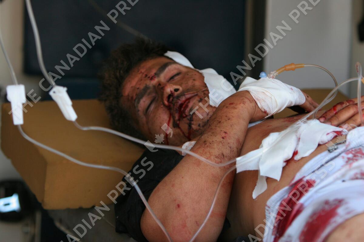 A man injured by a car bomb blast is taken to hospital, in Baghdad, Iraq, Tuesday, March 7, 2006. At least seven people were reported killed and 11 injured Tuesday in scattered bombings, mortar and gun fire in Iraq's beleaguered capital, police said. Iraq's president failed in a bid to order parliament into session by March 12, further delaying formation of a government and raising questions whether the political process can withstand the unrelenting violence or disintegrate into civil war. (AP Photo/Karim Kadim)