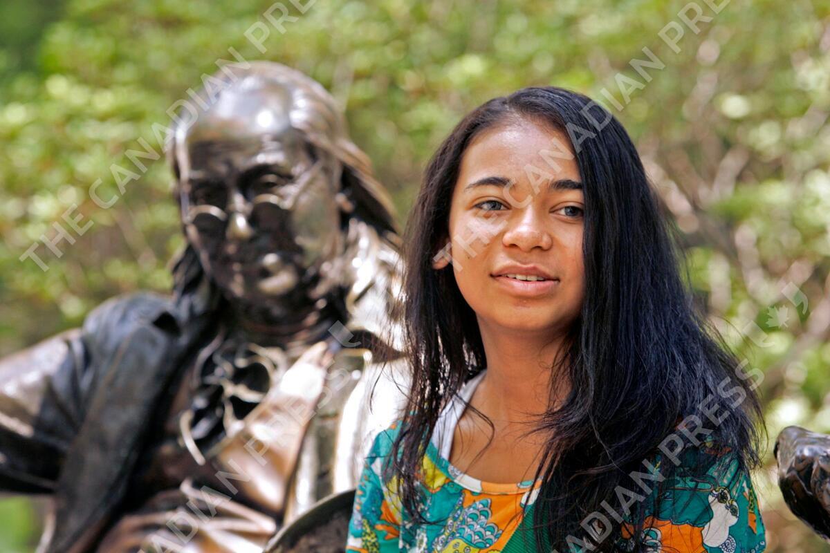 Brittney Exline, 15, of Colorado Springs, Colo., is shown with a statue of the founder of the University of Pennsylvania, Benjamin Franklin, during an interview with The Associated Press on the campus in Philadelphia, Tuesday, Aug. 28, 2007. Fifteen-year-old Exline plans to begin her Ivy League career Wednesday, Sept. 5, 2007, when classes start at the university. (AP Photo/George Widman)