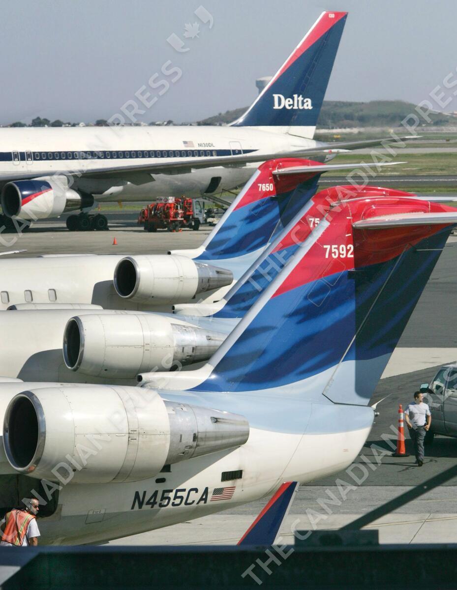 ** FILE ** In a file photo Delta and Delta Connection jet aircraft appear on the tarmac near the terminal at Boston's Logan International Airport, in Boston, Thursday, Sept. 23, 2004. Delta Air Lines Inc., hobbled by high fuel costs and heavy debt and pension obligations, filed for bankruptcy protection from its creditors Wednesday, Sept. 14, 2005, becoming the third major carrier to enter Chapter 11 since the 2001 terrorist attacks. (AP Photo/Steven Senne)