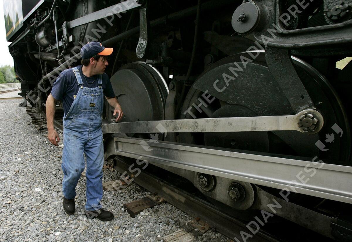 Fireman Ray Larson checks over the giant parts of Engine No. 734, a 1916 Baldwin locomotive, before starting its return trip from Frostburg, Md., to Cumberland, Md., Aug. 5, 2005. Steam train buffs are rallying to save the tourist train, pulled by a 1916 Baldwin locomotive on some of its 32-mile, round-trip runs between Cumberland and Frostburg on the old Western Maryland Railway line. A state subsidy that helped sustain it through 16 spring-through-fall seasons is ending this year, raising the possibility that the railroad's private, nonprofit operator will have to find another, less costly route or shut down altogether. (AP Photo/Chris Gardner)