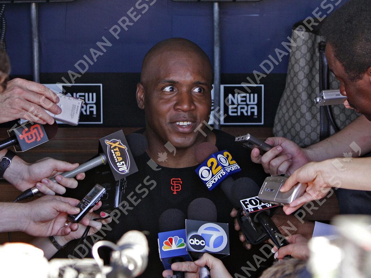 San Francisco Giants Barry Bonds holds a pre-game news conference after taking batting practice at Dodger Stadium in Los Angeles prior to the Giants game against the Los Angeles Dodgers Monday, Sept. 5, 2005. (AP Photo/Kevork Djansezian)