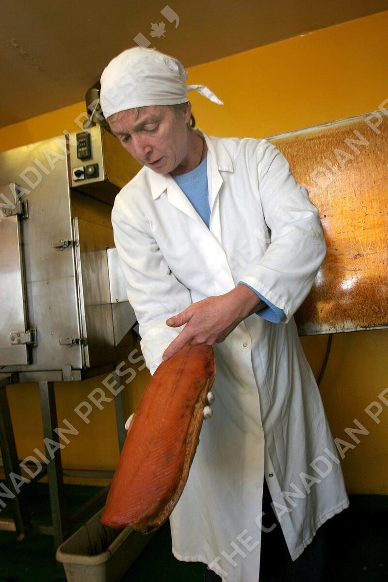 Sally Barnes examines a fillet of salmon she's taken out of her cold smoker at the fish smoking business she runs at Castletownshend, Ireland, Saturday, Oct. 8, 2005. Smoking, a three- to four-day process, seals the fish by drawing out natural oils and Barnes checks doneness by reading the gleam of the flesh. Last year she smoked 3 tons of salmon. All of it comes directly from fishermen, directly from the sea. (AP Photo/Larry Crowe)