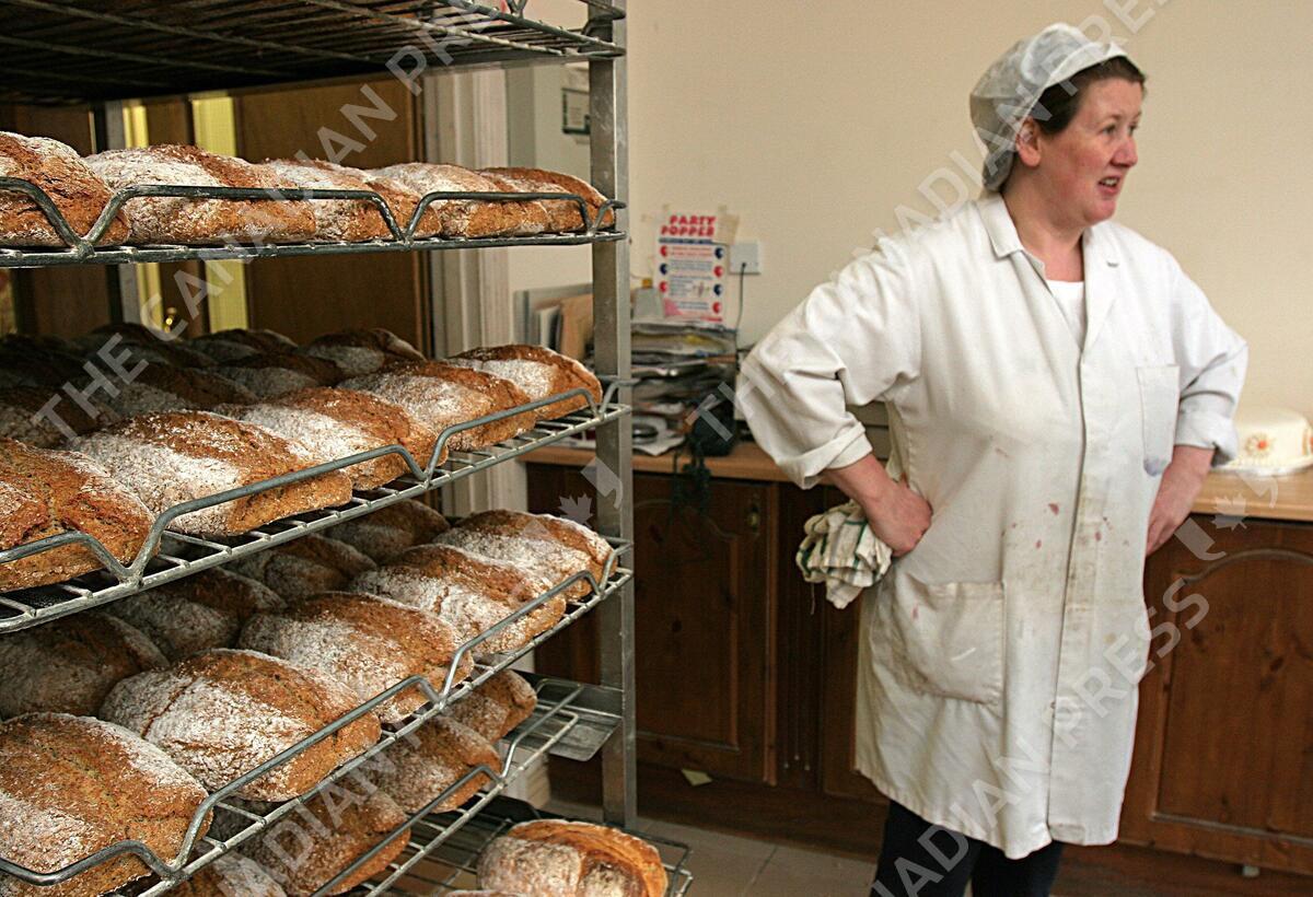 Michaela Kennedy, a third-generation baker, presides over The Dainty Bakery, in Arklow, Ireland, where she's shown beside racks of hand-shaped loaves of the richly colored soda bread the bakery has been producing for 45 years, Friday, Oct. 7, 2005. Few bakers still hand-form loaves, but Kennedy says her business is strong because enough people care about their food to keep the bakery busy six days a week. (AP Photo/Larry Crowe)