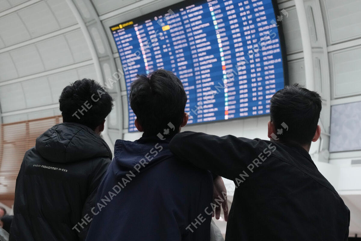Porter Passengers look up at the departure board at Toronto Pearson Airport, on Friday, July 19, 2024. A global technology outage had grounded flights, disrupted hospitals and backed up border crossings in Canada, with Toronto Pearson International Airport and Montreal - Trudeau International Airport both said the outage could lead to flight delays and cancellations. THE CANADIAN PRESS/Chris Young