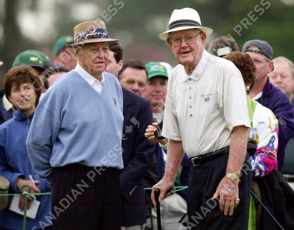 ** FILE ** Sam Snead, left, and Byron Nelson stand on the first tee prior to starting the 2001 Masters at the Augusta National Golf Club in Augusta, Ga. in this April 5, 2001 file photo. Nelson, who had the greatest year in the history of professional golf when he won 18 tournaments in 1945, including a record 11 in a row, died Tuesday, Sept. 26, 2006. He was 94. (AP Photo/Elise Amendola)