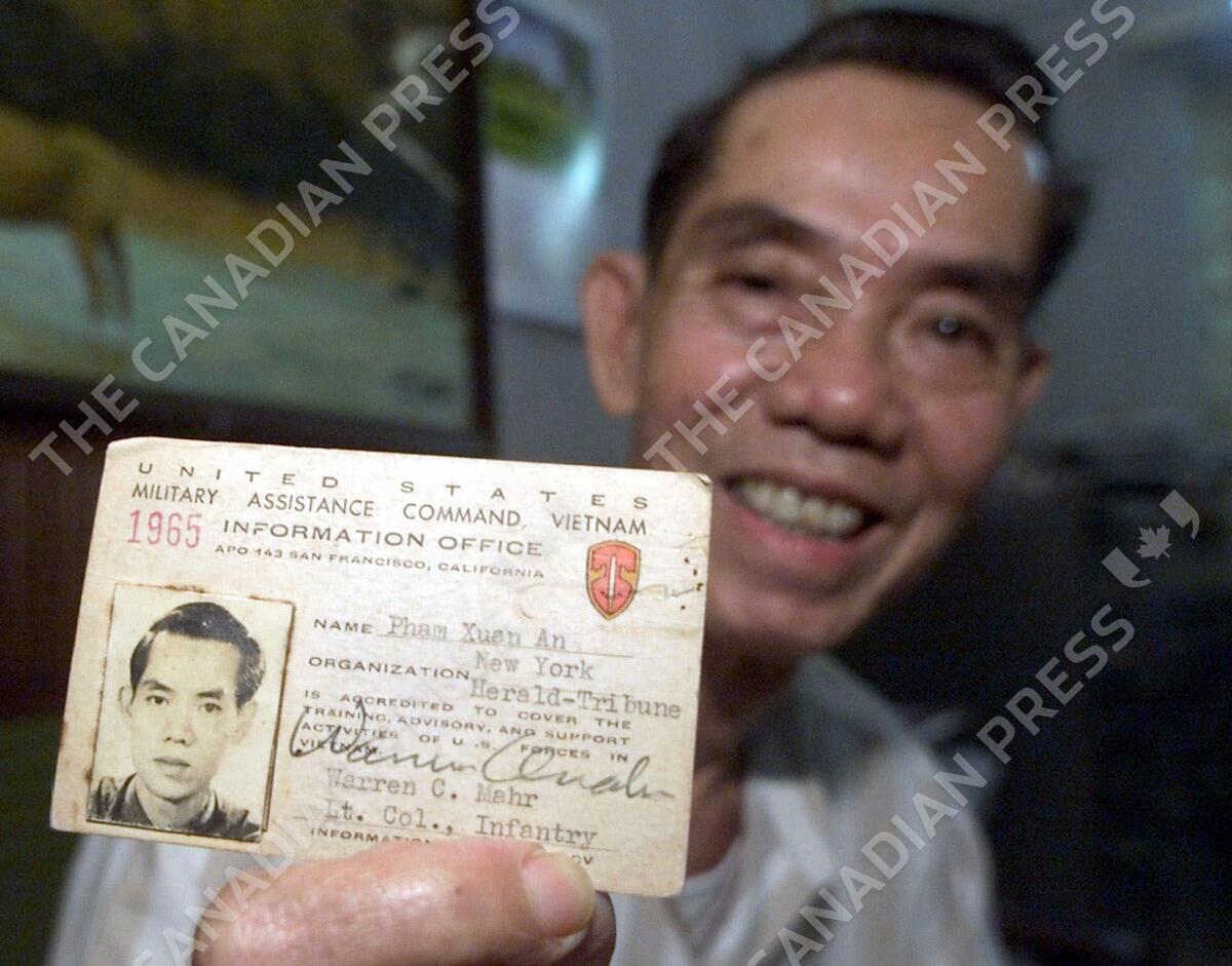 ** FILE ** Pham Xuan An holds up his press card from 1965 at his home in Ho Chi Minh City, Vietnam, in this April 26, 2000 file photo. Pham Xuan An, a Vietnamese who led a remarkable and perilous double life as a communist spy and a respected reporter for western news organizations during the Vietnam War, has died at a military hospital Wednesday, Sept. 20, 2006 in Ho Chi Minh City, his son said. An, 79, suffered from emphysema. (AP Photo/Charles Dharapak, File)
