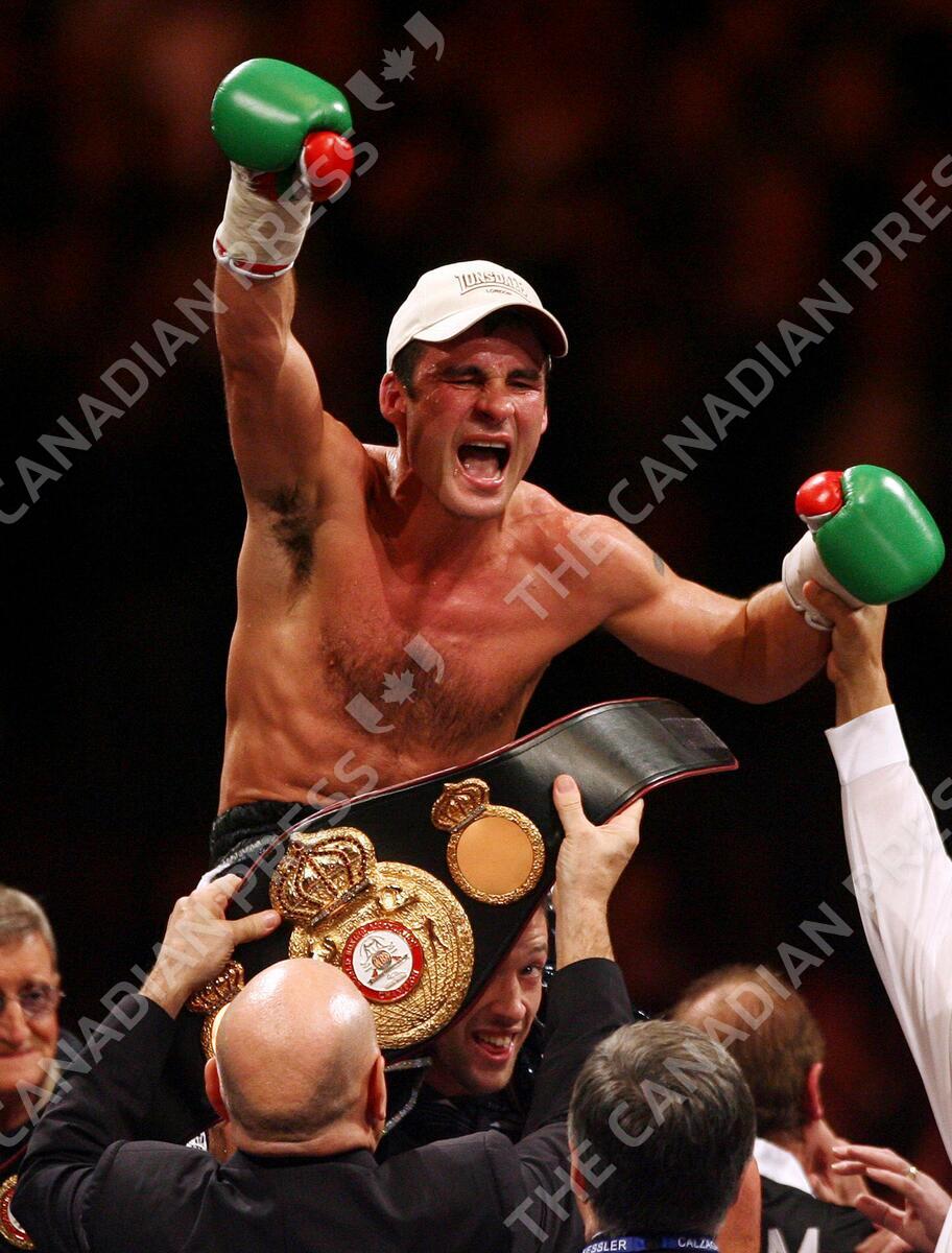 FIEL - In this Nov. 4, 2007 file photo, Britain's Joe Calzaghe celebrates after winning his bout against Denmark's Mikkel Kessler in a fight for three world super-middleweight titles in Cardiff's Millennium Stadium. Oscar De La Hoya, Felix Trinidad and Calzaghe head the class of 2014 to be inducted into the International Boxing Hall of Fame. (AP Photo/Simon Dawson, File)